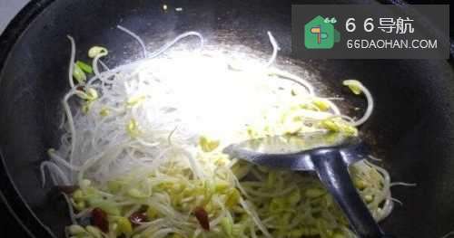 5放入备用的豆芽,在锅里翻炒,在放入葱,一起翻炒。