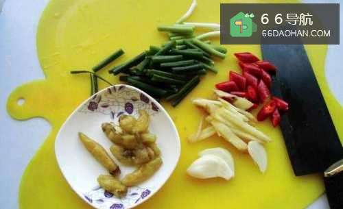 3泡椒和泡姜切丝和段,辣椒洗净切丁、香葱洗净切段。