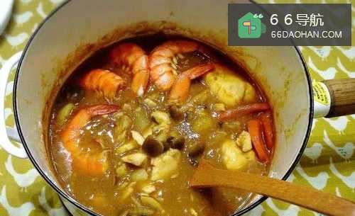 4将高汤、食材、咖喱块,再加一碗水,倒入较大的锅中炖煮15分钟。