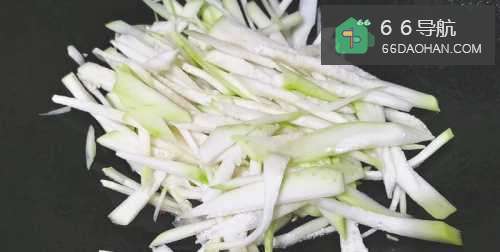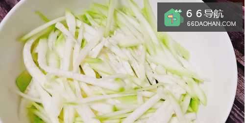 2把半个葫芦瓜切成丝,装在碗里备用。