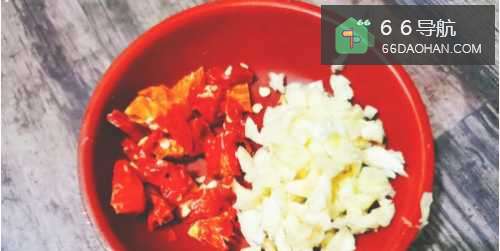 4起锅烧油,先放切碎的辣椒和大蒜用小火煸出香味。