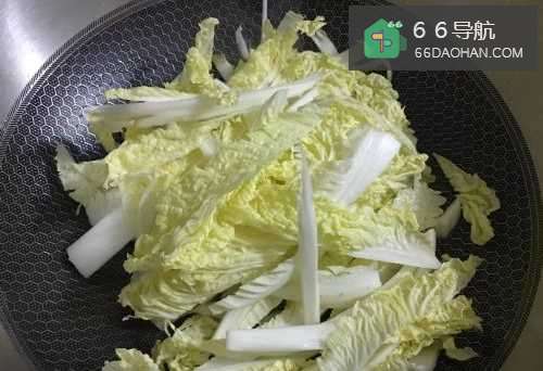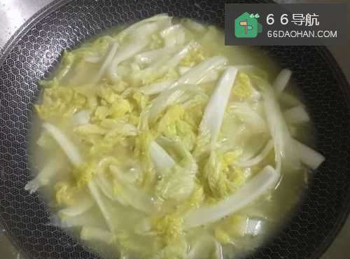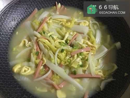 6待娃娃菜煮出水分、浓汤宝融化,就可以加入鸡蛋丝跟火腿丝了,继续煮2分钟。