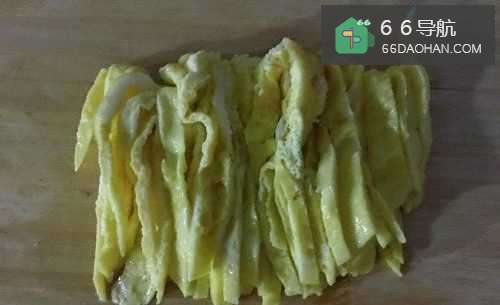 2鸡蛋打散,油热六七成下去,小火慢慢摊成鸡蛋皮。