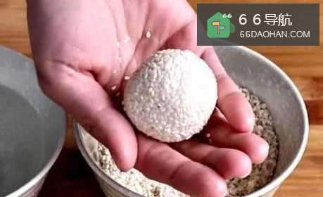 4然后准备一个碗,放入白芝麻,将滚好的圆球先沾上点清水,然后放入白芝麻中滚一圈,粘裹上白芝麻后,再用手轻轻按压,使其可以粘牢,依次做好所有的之后即可下锅油炸;