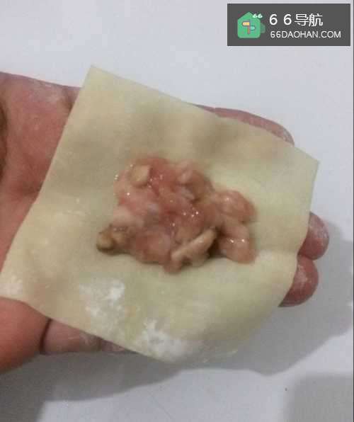 8包混沌的时候,先取一张皮,把肉馅放一大坨在皮的中间,然后把皮的一角裹住肉馅,再把左右两角轻轻捏在一起。
