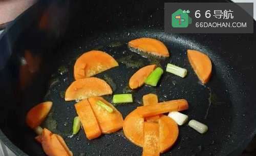 2热锅加油,下红萝卜片、葱白爆香