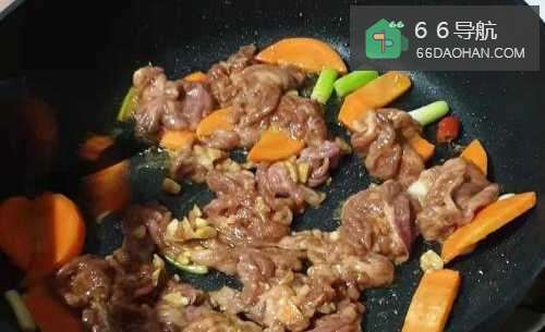 3然后将腌过的羊肉下锅拌炒