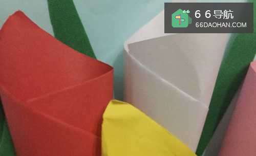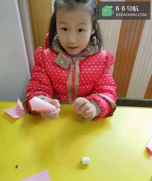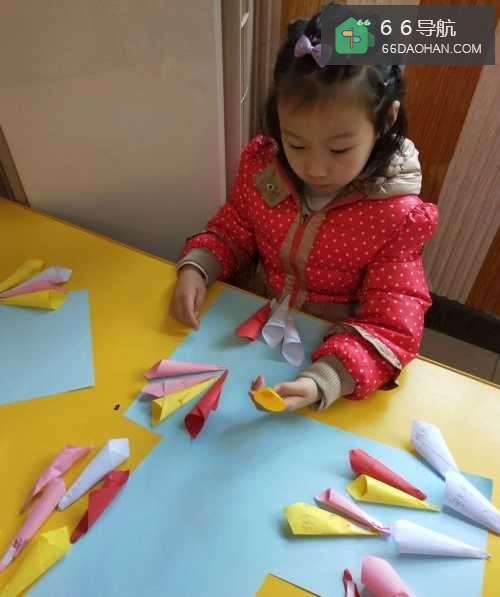 2再用几种颜色的长方形纸裹一朵小花,用双面胶粘住(定型)。