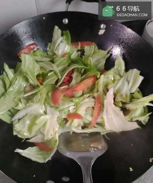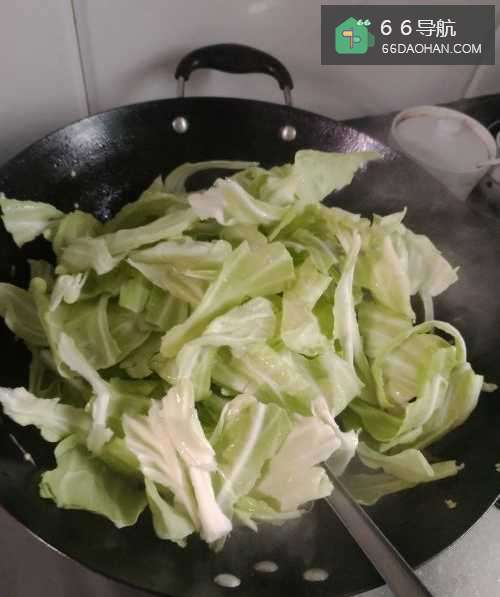 5第五步,向锅里倒入白菜和胡萝卜,加入适量水翻炒一会。