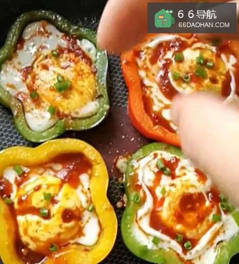 3然惹羞后往彩椒圈中打入鸡蛋,小火慢煎;