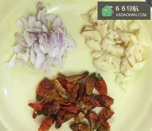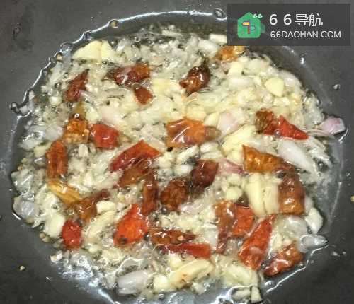 4锅洗净烧热,先放适量油将葱、蒜和干辣椒爆香。