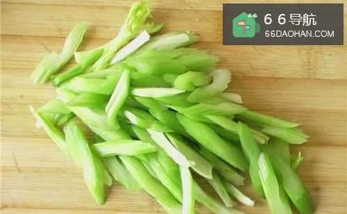 2第二,将芹菜洗净,将芹菜叶去掉,将芹菜切成小块,备用。