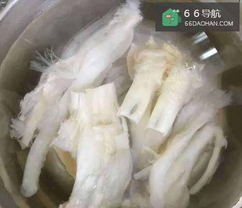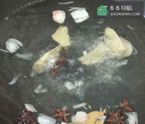 3然后用桂皮、八角、香叶、生姜、葱头、料酒煲一锅滚水,再放入牛筋,小火炖40分钟。