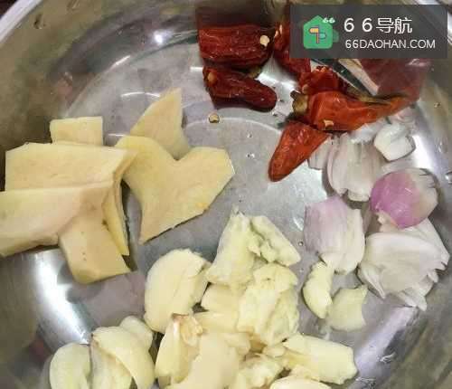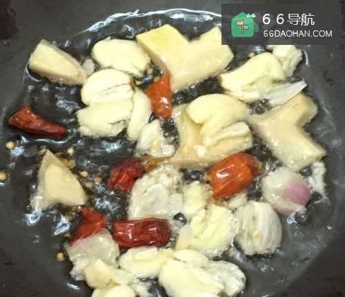 6炒锅热油,先将姜葱蒜、干辣椒炒香。