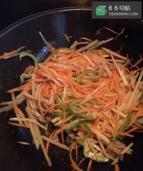 6再将土豆丝放入锅中,和胡萝卜、肉一起炒。