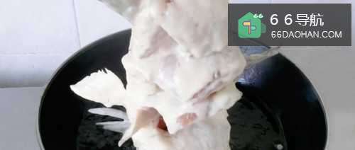 2将炒锅置于大火上,放食用油加热至150℃,将鱼身均匀裹上脆皮糊,将鱼头放入锅中炸定型,然后放入鱼尾完全入油中,炸至熟透捞出,待油温升高到180°C再把鱼放入炸一次至金黄色且外皮酥脆捞出待用.然后放在鱼盘中,用手轻压鱼一下,方便食用。