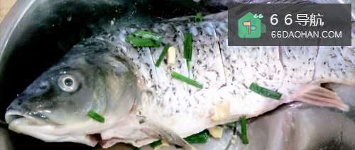 初加工后鲤鱼,先在鱼的头顶切一小口,用刀轻敲打鱼身,每边片五刀,刀距深度相等。
