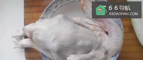 将白条鸡洗干净,控水,用镊子将鸡身上的细毛摘干净。