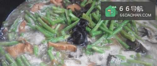 7然后,将焖锅中的鸡块和鸡汤、木耳、香菇都倒进豆角锅中,喜欢吃粉条的,将粉条放入锅中。