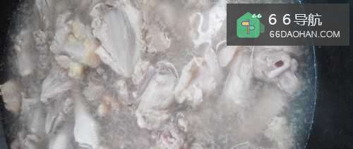 2剁小块,放入冷水锅中,开火,煮沸后,捞出。