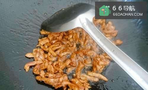 4热锅倒油,放入肉丝滑炒至变色。