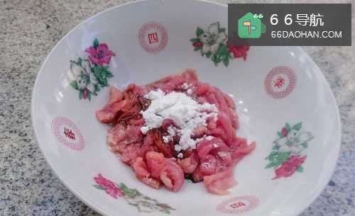 2瘦肉切丝,用料酒,酱油,淀粉和食用油腌制。