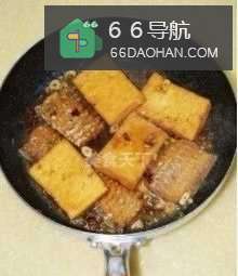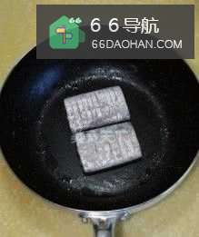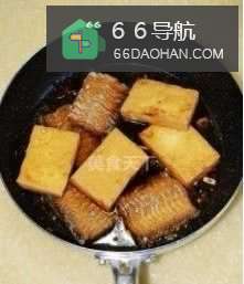 4平底锅加油,将带鱼段、豆腐块分别入锅煎至表皮成金黄色