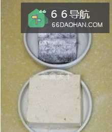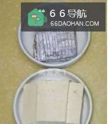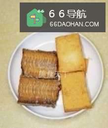 3带鱼洗净后,切成段状,在带鱼段两面各划一字刀,北豆腐切成与带鱼段大小一致的块状