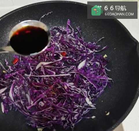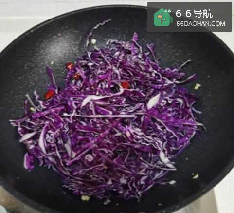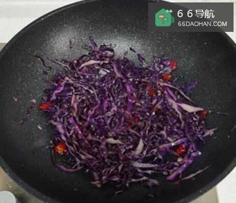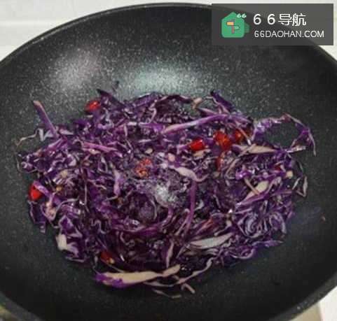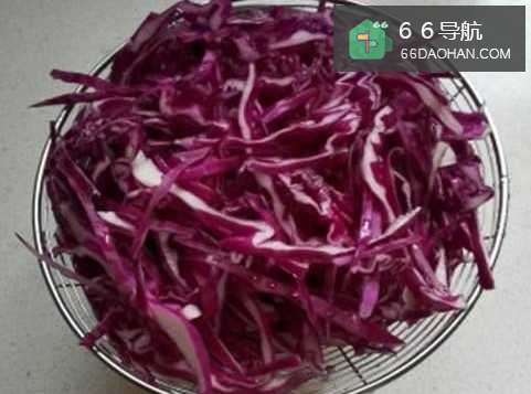 2紫甘蓝切丝冲洗干净用漏勺控干水分备用。