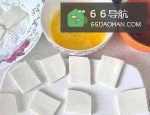 7豆腐切块裹上淀粉,再裹上鸡蛋液