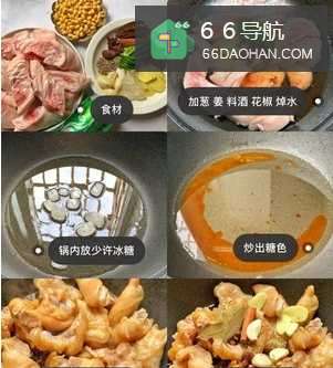 锅内放油加入少许冰糖炒出糖色,倒入猪蹄翻炒上,接着放入姜、蒜、八角、草果、香叶、小茴香炒出香味