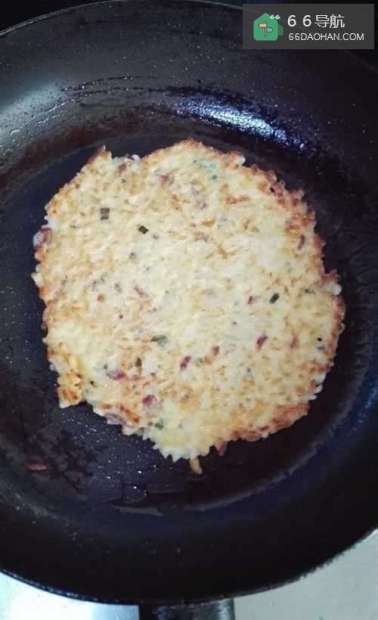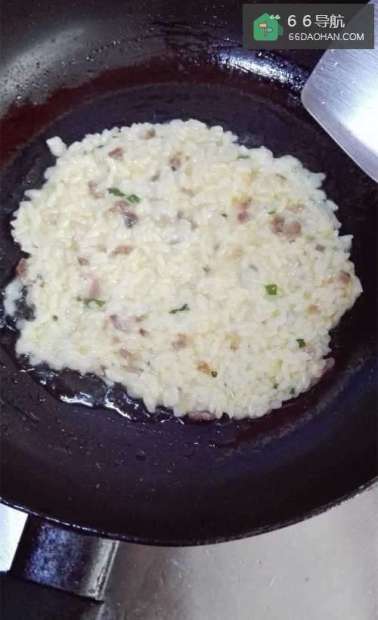 5平底锅放少许油烧热后,放入适量米饭,用锅铲在米饭上压一下,让它变成圆饼状,火不要太旺,不然容易焦。