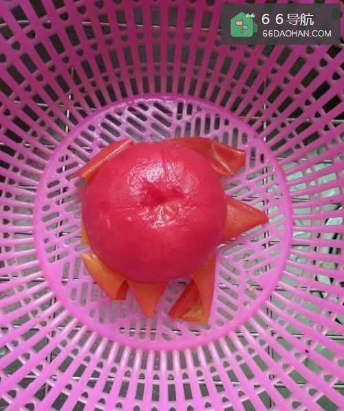 3捞起西红柿,把外皮剥下来,用开水烫过后西红柿皮就很容易剥了,西红柿去皮后口感更好。