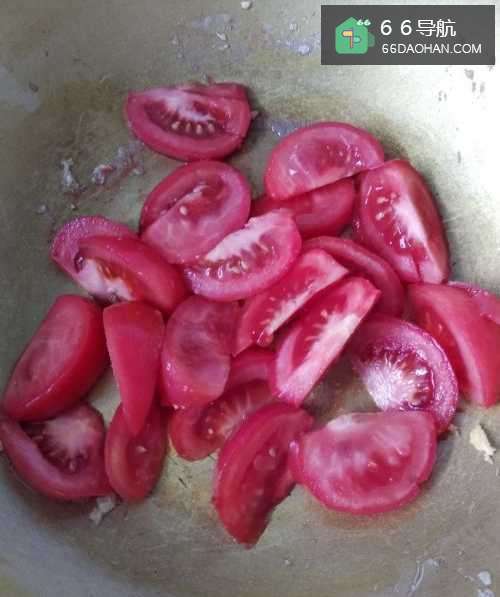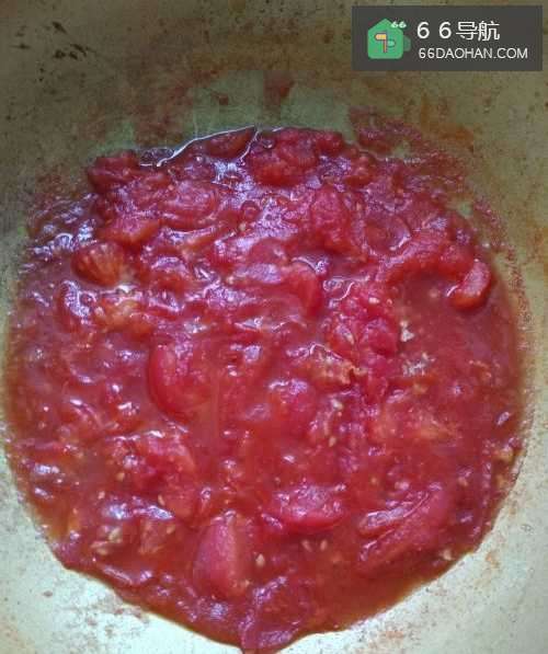 7锅里的余油下西红柿翻炒,加盐,加水半碗,开中火焖煮一会。