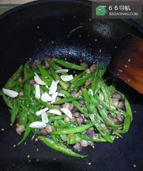 5看到辣椒变软后放入大蒜翻炒一分钟。
