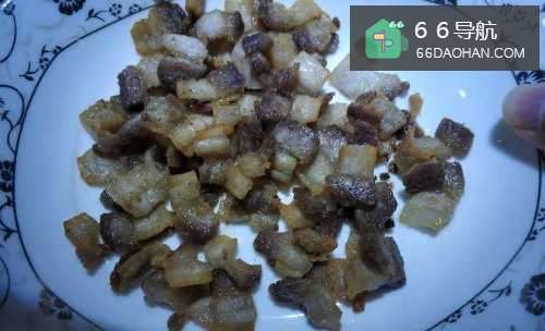 2、把切好的五花肉放入锅中,先大火再小火炒出金黄捞出。