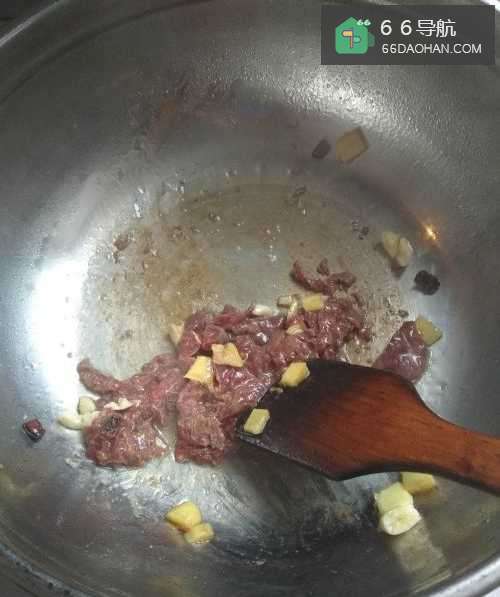 5然后倒入腌制好的牛肉!翻炒均匀!