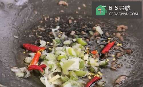 3然后,加入细香葱,姜,大蒜和干辣椒炒。