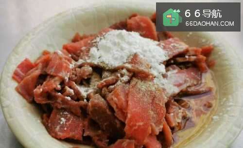 2、接下来,加热油,加入牛肉片,炸至白色,即成。