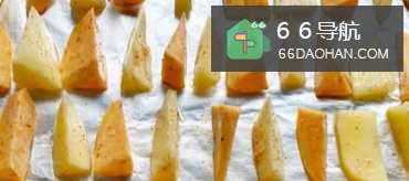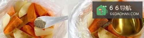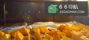 5烤盘铺上锡纸,放入腌制好的土豆和红薯。