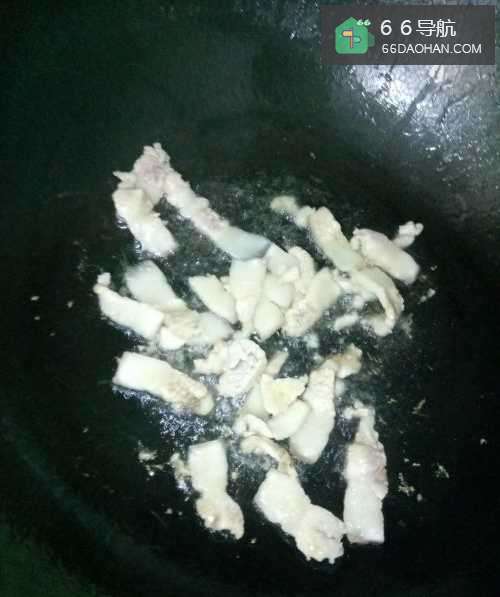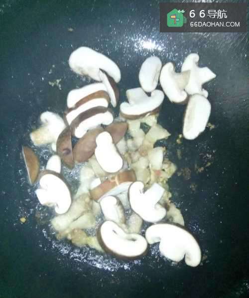 4五花肉炒至出油、变黄,再将香菇片下入锅里,翻炒均匀、炒香;