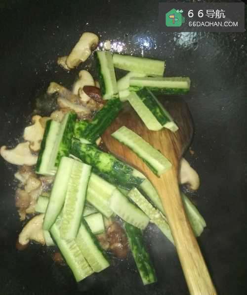 5待香菇翻炒至变软、飘出香味时,将青瓜也下入锅里,翻炒均匀;