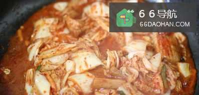 4待五花肉炒至微黄倒入泡菜翻炒,接着加入适量清水炖10分钟左右,汤汁倒入,加入适量鸡粉调味即可。