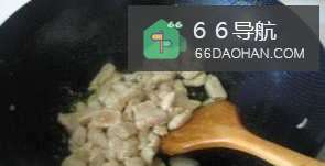 22、在锅里倒入油,开火烧热后加入花椒、蒜末以及豆瓣酱等调料爆香,之后倒入腌制好的鸡胸肉翻炒