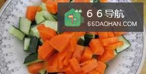 33、变色后加入切好的胡萝卜和黄瓜,一起颠锅翻炒,出锅后在上面撒上一些葱花作为装饰,这样好吃的宫保鸡丁就完成
