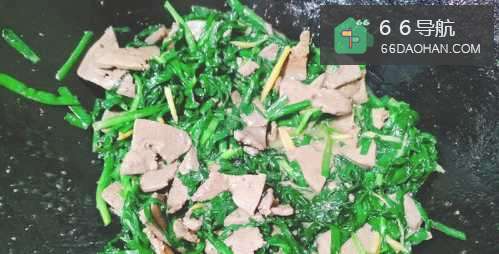 6起锅放花生油把韭菜炒至七成熟后,倒入炒好的猪肝。