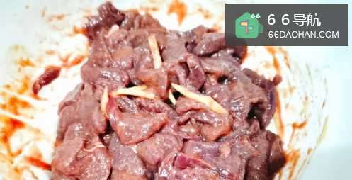 2将生姜去皮,再切成丝,放进装猪肝的碗里,再放少量蚝油,鸡粉,盐均匀搅拌腌制十分钟。