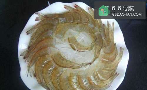 2将虾头切掉,去虾线,粉丝放盘内上面铺上虾。