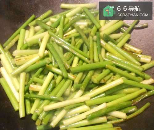 5再将之前做好的蒜心加入锅中与肉片翻炒,在起锅时加入葱末,翻炒几秒后入盘。