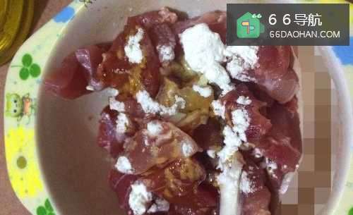 3肉片加入淀粉、食盐、酱油搅拌腌制一小会;